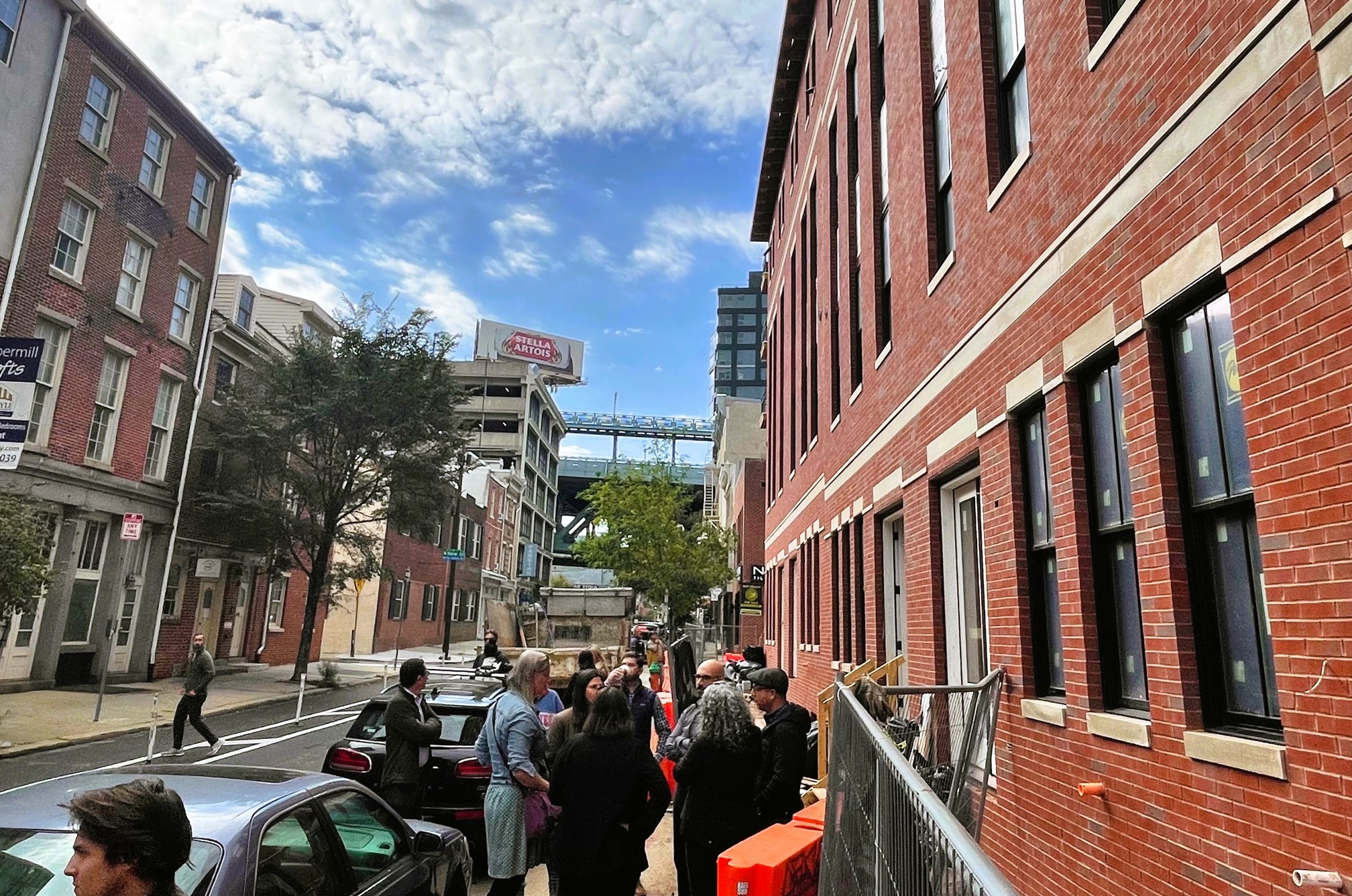 As you have likely guessed by now, this property looks dramatically different today. And that’s because an affiliate of our very own parent company OCF Realty is developing the Philip Street Townhomes, featuring eleven new-construction homes that have continued the residential turn on the block. Those homes, designed by Landmark Architectural Design, are progressing nicely, with their brick and cast stone facades forming a warm and welcoming addition to the northern edge of Old City.