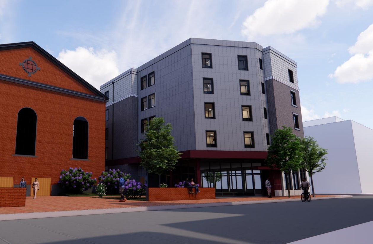 Remarkably, the 1760s rowhouse is getting picked up and moved to the southern end of the property along 4th Street. The impetus for this move is a plan for a five-story, 34-unit homeless shelter at the corner. This project, called Old First House, comes to us thanks to Old First Church, which has been providing shelter for the homeless since the 1980s, Community Ventures, and DePaul USA, with a design from O Z Collaborative. The project will entail 34 efficiency units, community rooms, offices, and 2,400 sqft of commercial space will activate the corner while providing crucial services for those in need. The non-historically protected 1970s reconstruction will be meeting the wrecking ball to make space for the new construction.