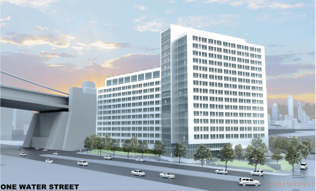 Over the weekend, we were enjoying a not-oppressively-hot afternoon at Race Street Pier and were reminded about the One Water Street project. Numerous plans have come down the pike for 230 N. Columbus Blvd. over the years, so you can forgive us for being pessimistic when PMC Property Group presented plans for this address back in the spring of 2014. Despite our negative attitude, the project is very much under construction.
