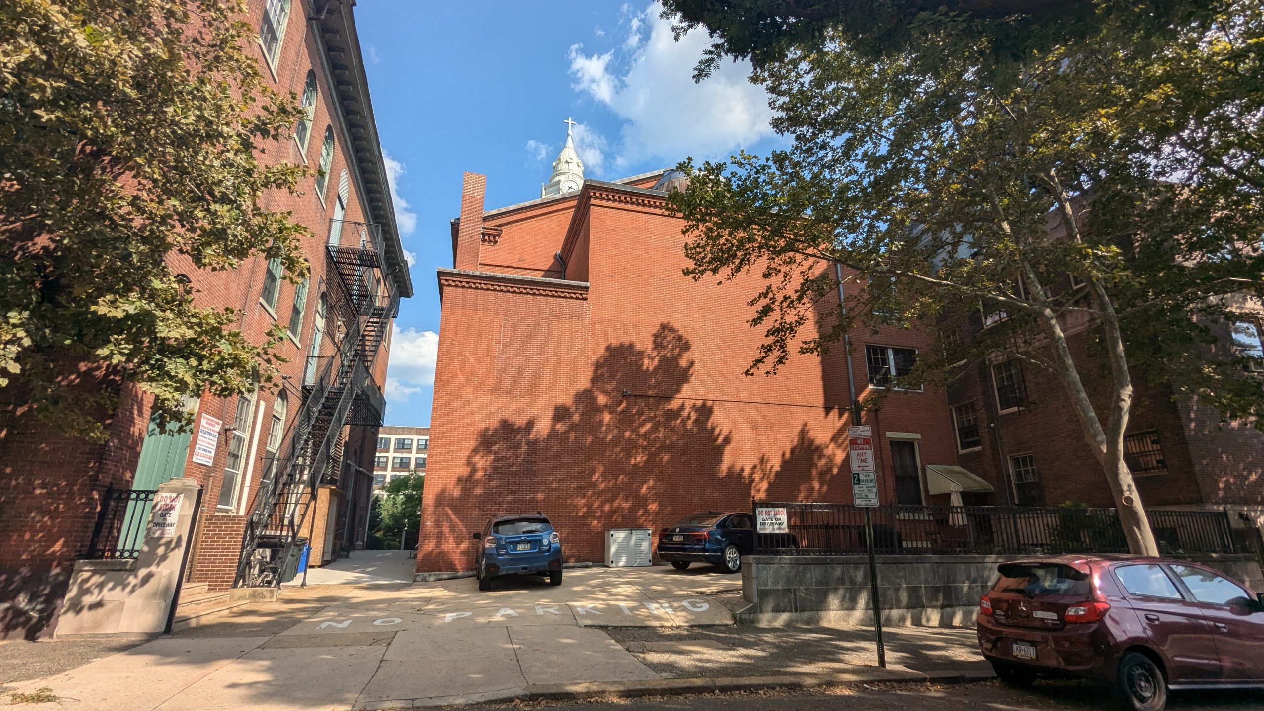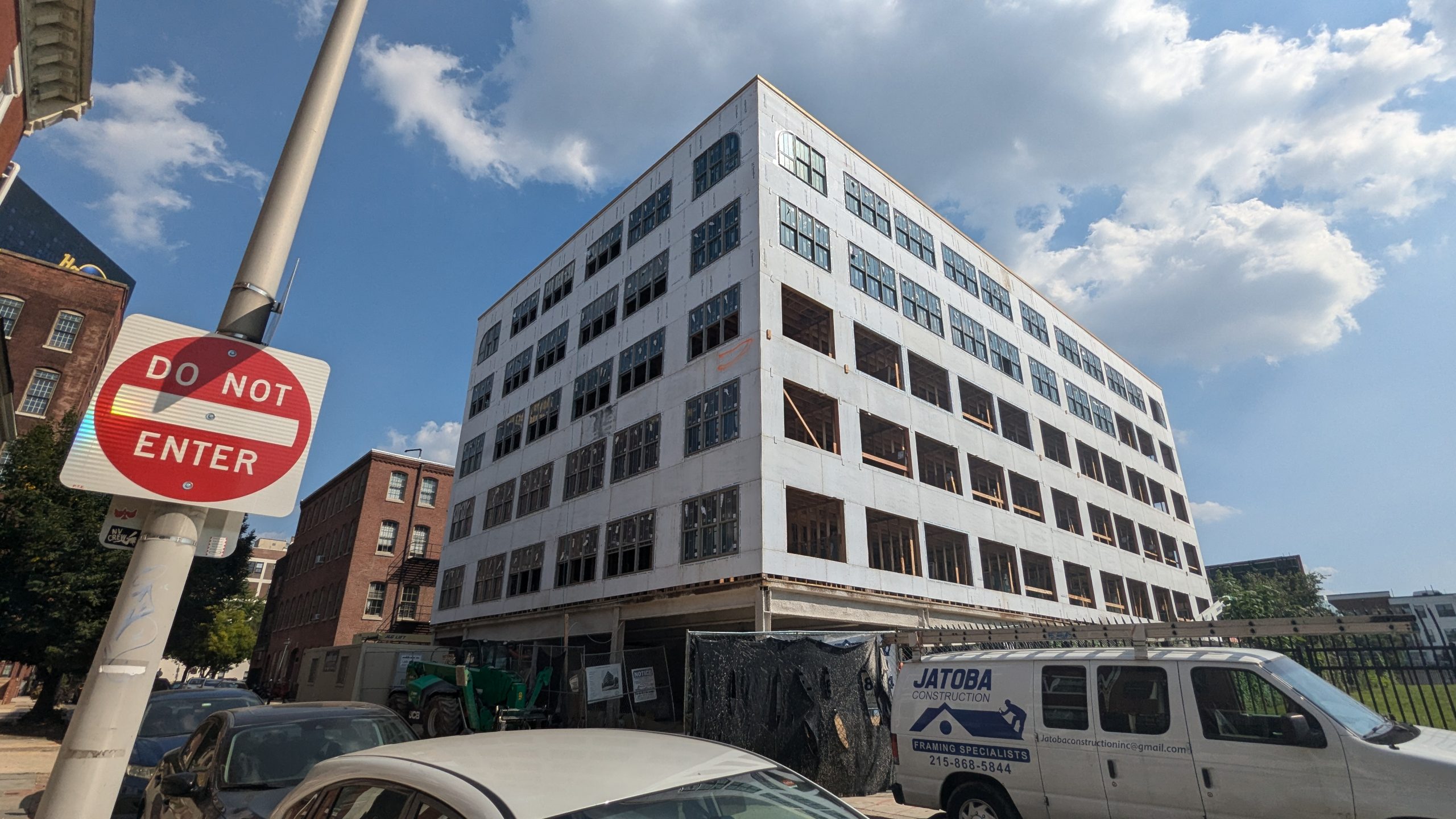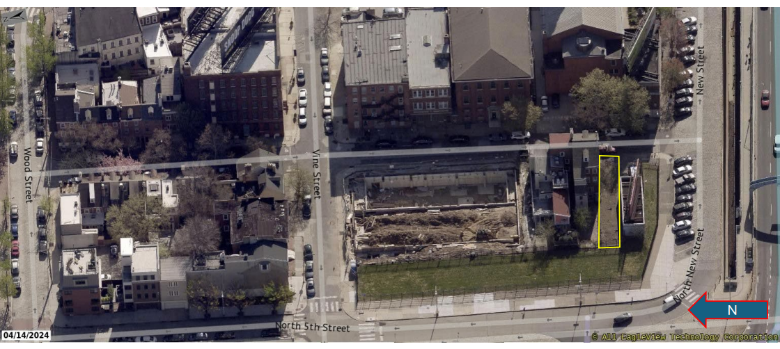 At only 50′ tall to the top of the parapet, this structure will remain comfortably shorter than several buildings in the immediate vicinity, including the historic Saint Augustine’s RC Church across the street, and a six story apartment building currently under construction down the block at 416 Vine Street.