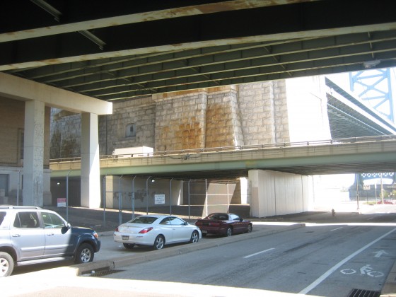 In general, this is a nice first effort by the DRWC and the Streets Department. They’ve successfully made an undesirable stretch of sidewalk much more pedestrian friendly, and we suspect that this improvement will lead to more people braving the walk under the highway to explore the new park. One thing that did catch our attention was the apparent incompleteness of the project. Sure, the southern side of Race St. is dramatically improved, but what about the north side of the street?