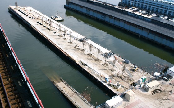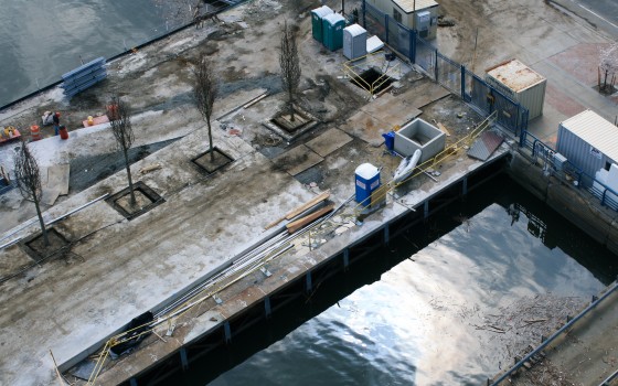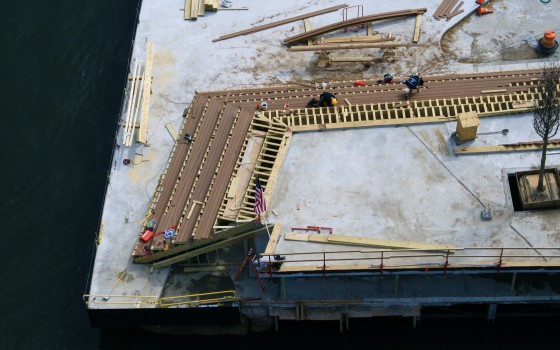 With a grand opening set for May 12—less than a month away—the construction of the Race Street Pier Promenade has really begun to take shape. You can now see a line of freshly laid trees on the upper-level sky promenade leading down the pier and to the lower-level social gathering space.