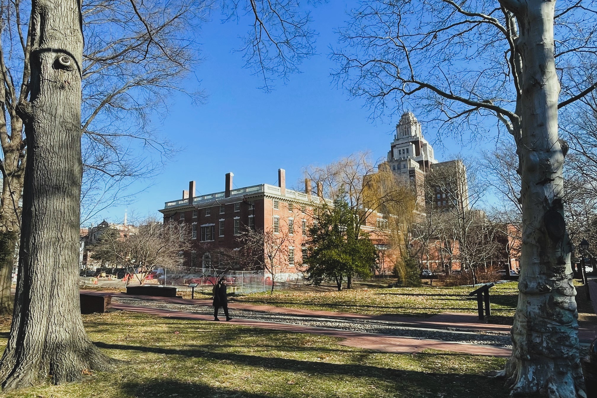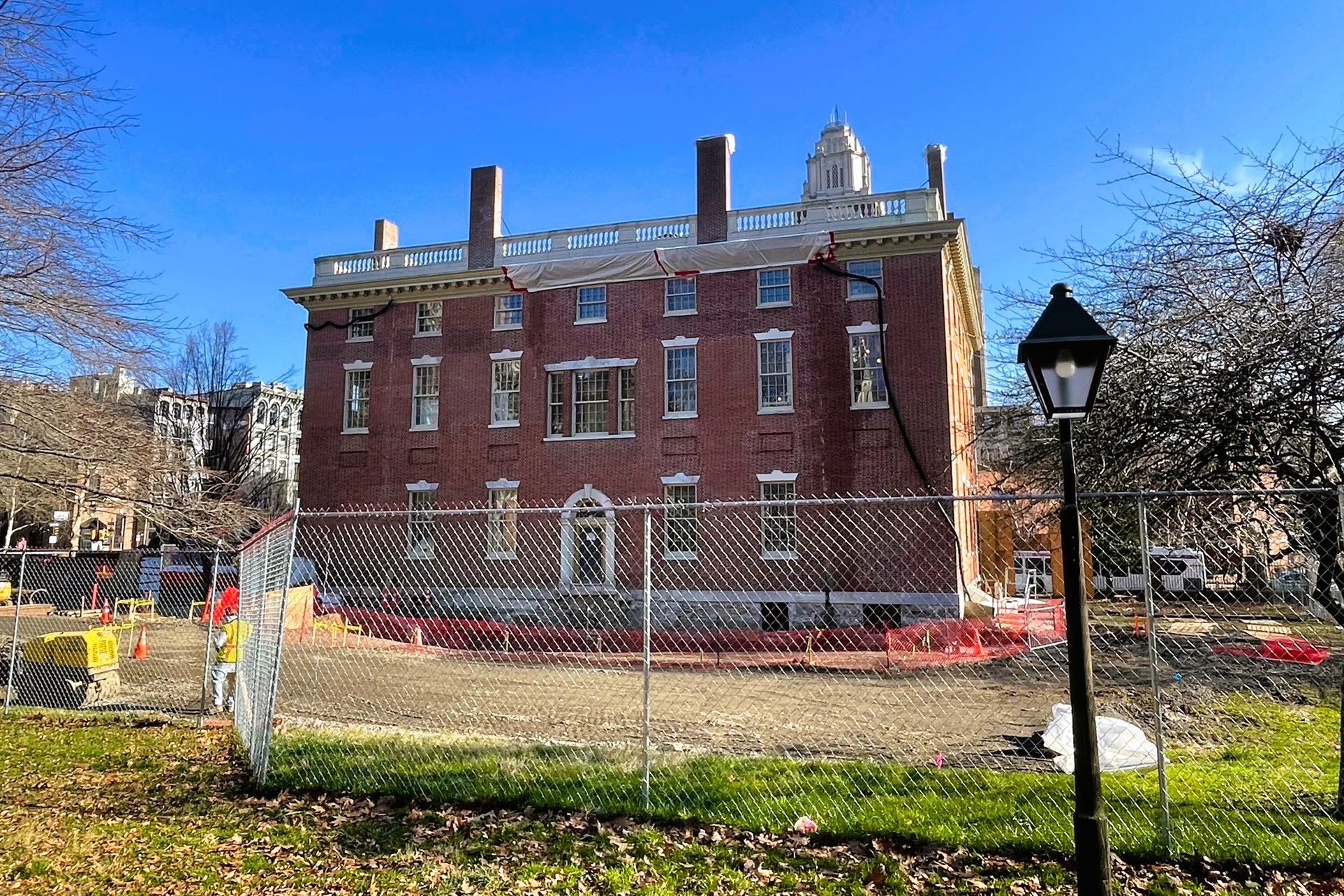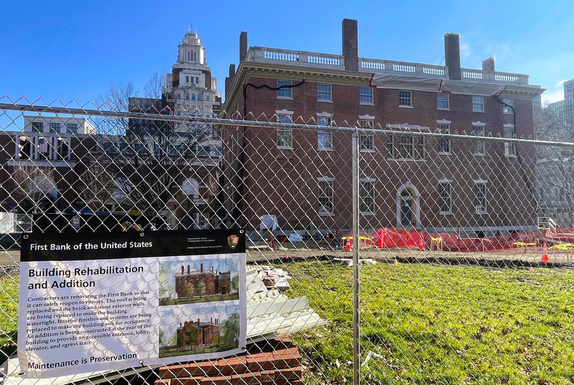 That is indeed a fenced-off First Bank of the United States, the stately structure built in 1797, which was the first building constructed for what was then new federal government. There are big plans for its future, thanks to that $22 million influx of funding that we referenced earlier (along with an additional $4 million of private funding from Independence Historical Trust), with a rehabilitation of the original structure paired with a new addition on the west side of the site. Work is in full swing on the bank building, which was originally designed by an amateur architect.