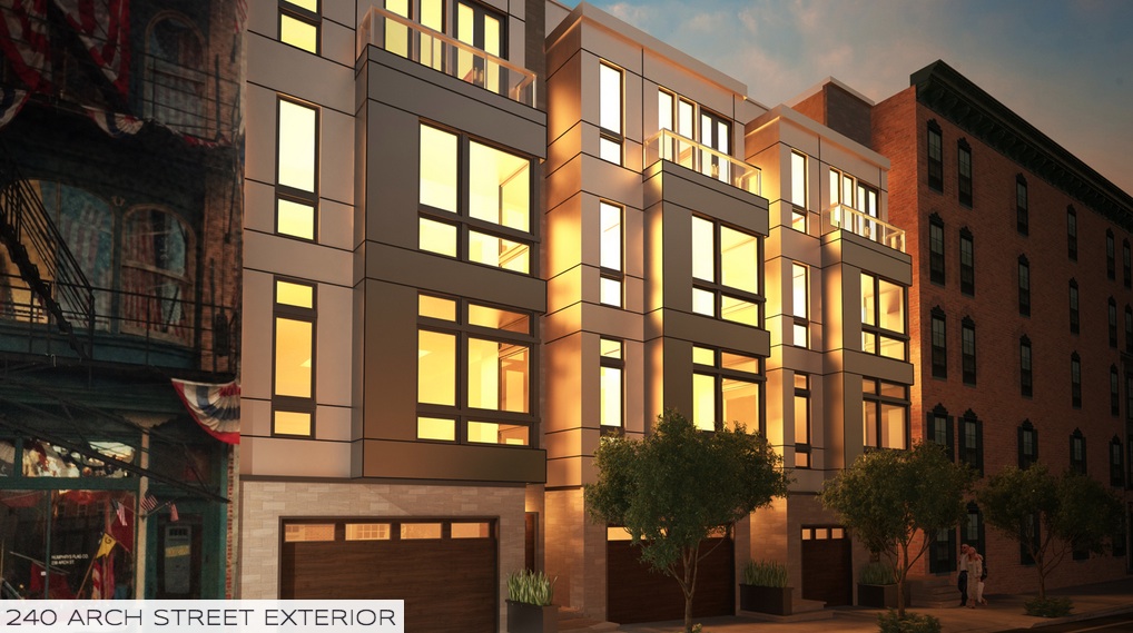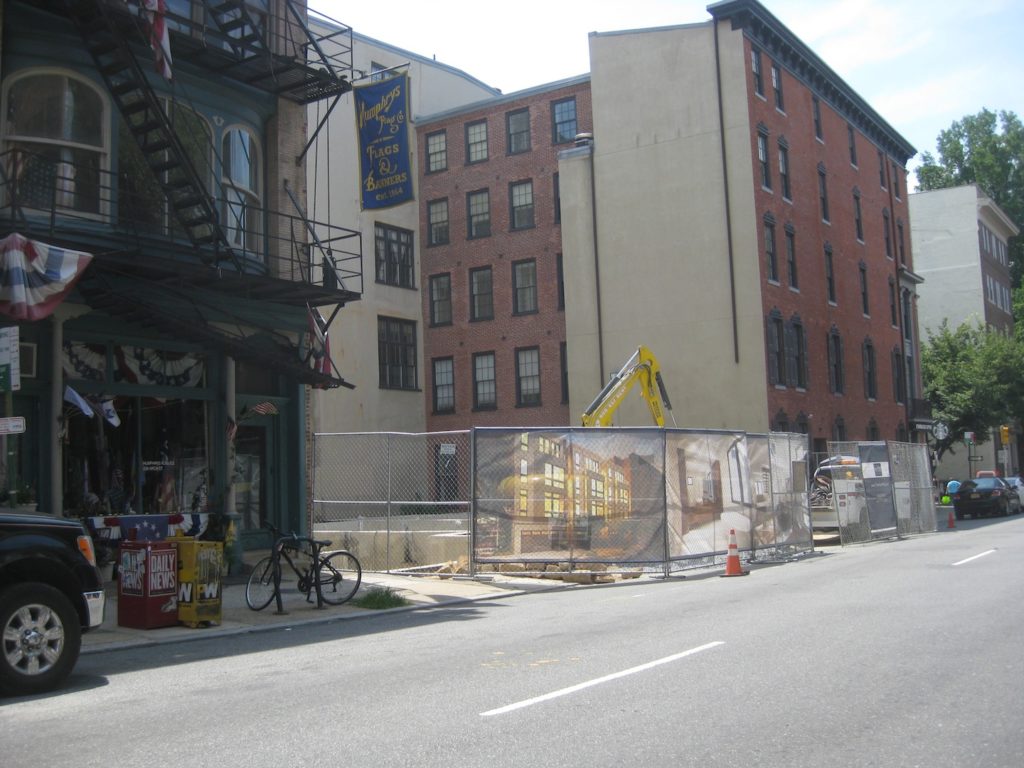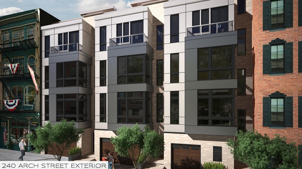 A couple of months back, we told you of plans for three contemporary mansions at 240 Arch St., right across the street from the Betsy Ross House. Passing by recently, we discovered that foundations have been poured for these homes.