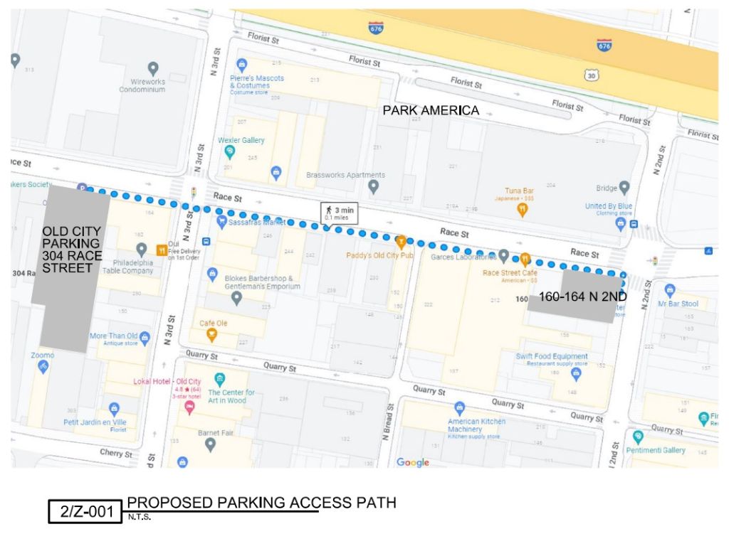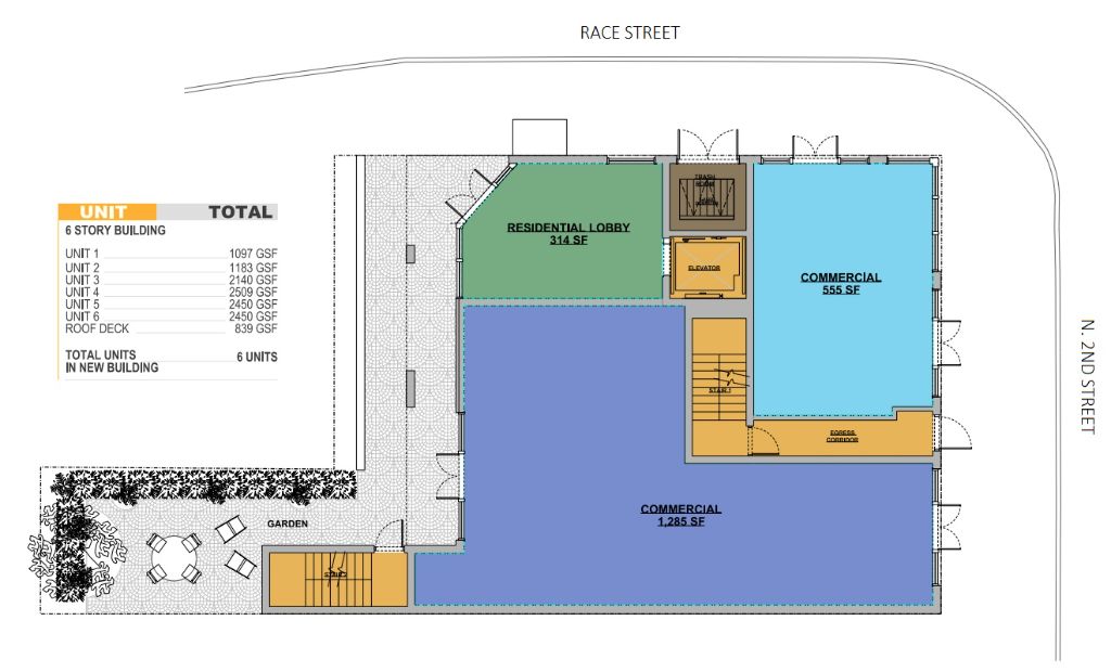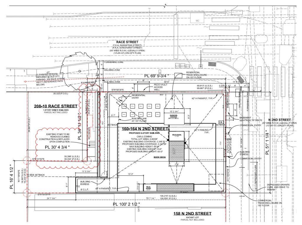 At long last though, we have an update with some legs. Zoning documents have been approved for the demolition of the two low-rise buildings on the corner, with a six-story mixed-use building dubbed “The Ben” to rise in their place. Plans call for two commercial spaces facing 2nd Street with a lobby entrance angled towards Race Street. Based on the layout and the access to outdoor space, we could see a cafe/restaurant filling the southern spot – yet another addition to a livelier 2nd Street. Parking, a necessary inclusion to procure a by-right zoning permit here, will be located offsite, about a block to the west on Race Street. At the moment, we just have site plans and a massing for the building from Morrissey Architects and BVG Property Group, so we’ll have to wait a bit before we know exactly how the new building will present itself.