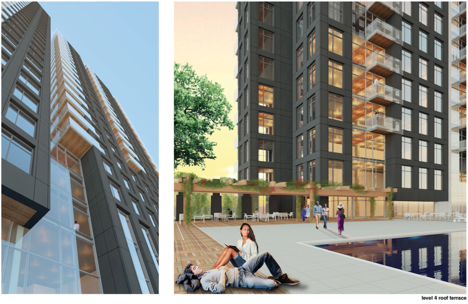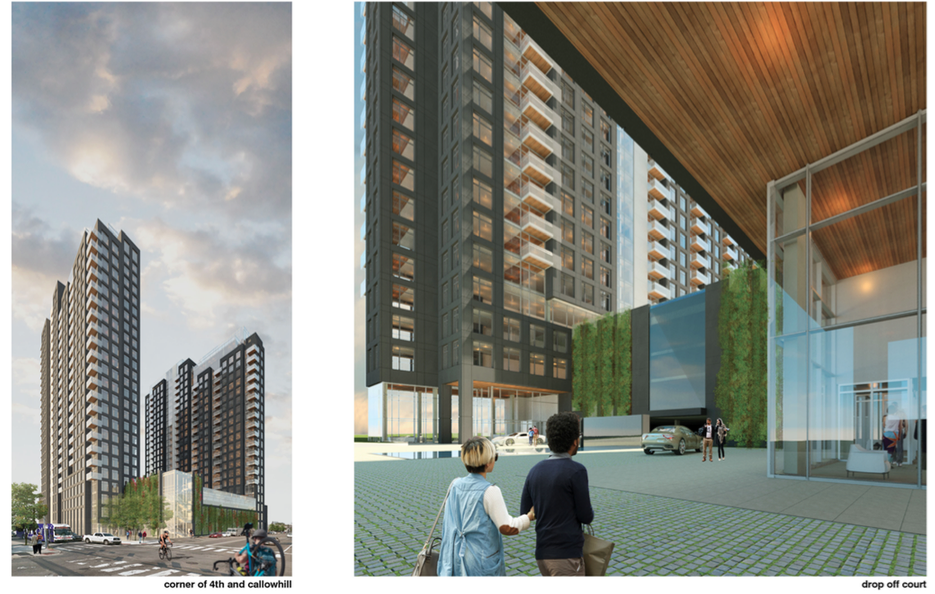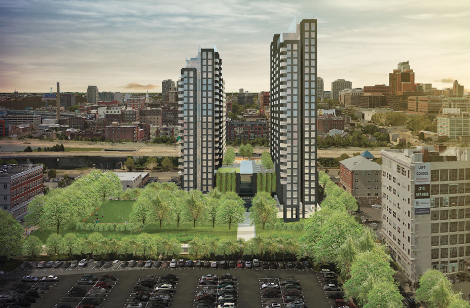 According to Philly.com, developer Mark Rubin intends to redevelop almost the entire block bounded by 3rd, 4th, Callowhill, and Willow Streets. Right now, this block includes a bunch of parking lots, an office building that houses, among other things, a local unemployment office, and a dialysis center at the corner of 3rd & Callowhill. The dialysis center will remain but everything else will disappear. In their place, the project calls for two residential towers of 24 and 27 stories which will sit on a three story parking deck. The building will include 454 apartments and 233 parking spaces. On the 4th floor, above the parking deck, will be a floor with amenities for residents including a swimming pool with highway views. On the ground floor, there will be two retail spaces on 4th Street and to the north of the building will be a large green space that has a major storm water management component.