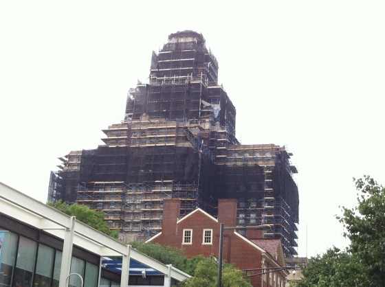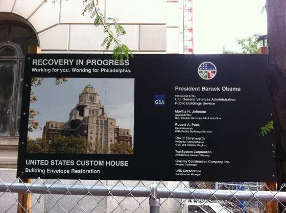 The $25M restoration is being done by Grunley Construction Company, and is still on pace to be completed about a year from now. Along with the masonry restoration you’d expect, Grunley will also be improving the HVAC system, replacing and repairing windows, increasing the building’s energy efficiency, and adding a green roof. Just as the original construction was paid for with New Deal dollars, this renovation is being paid for with stimulus dollars. Federal money for job creation never goes out of style! Figuring for inflation, the restoration will cost a little less than half of what it cost to build the Custom House in the first place.