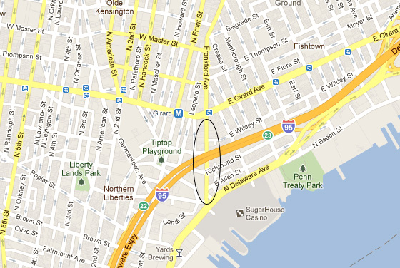 In the shadow of I-95, and right