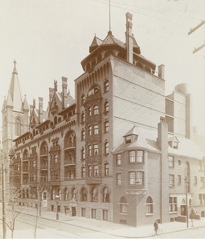 The southeast corner of 22nd and Chestnut, currently home to the CareRx Pharmacy which lies adjacent to the Sidney Hillman Medical Center, was once the corner of a residential block featuring architecture of Wilson Eyre. The building depicted in this pre-1922 photograph showcases the William Bradford Residence in its