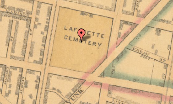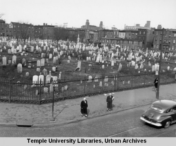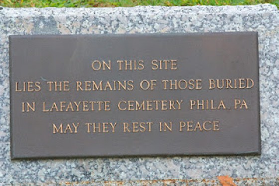 This is where things get sleazy.  The 1947 photo and the information which follow are also borrowed from the Cemetery Traveler site, where a more complete telling of events can be found.  This photo shows the land after it had just been cleared, the result of a real estate deal in which the city paid Thomas Morris, president of the Evergreen Memorial Park in Bensalem, a cool hundred grand to unearth Lafayette’s occupants and relocate them to his Bensalem cemetery.  There, the graves were to be marked and maintained.  Morris would also receive the title to the land in exchange for his services.