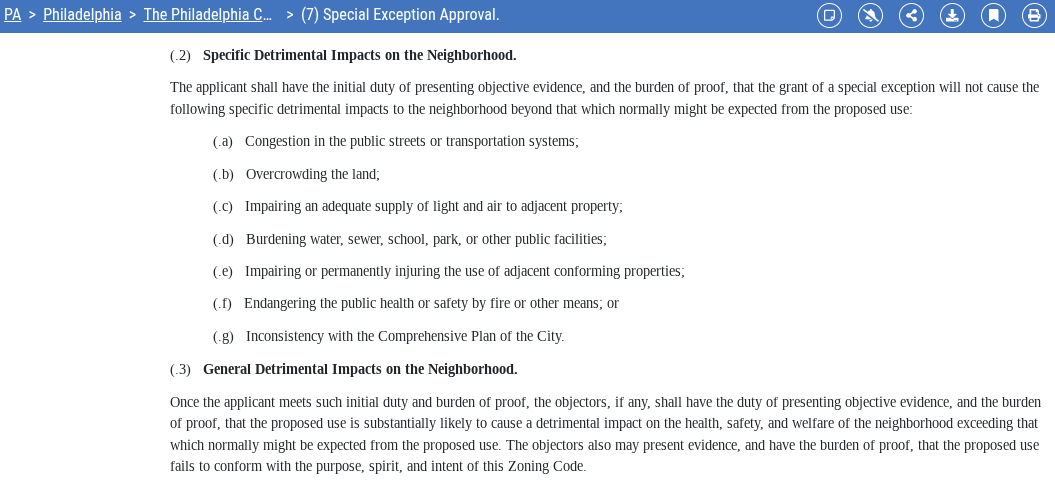 Sure, a comedy club sharing a building with a pawn shop, checking clearing business, and a church does sort of sound like the set-up for a joke. But we’re not certain that those concerns really address the threshold set out by the zoning code. The applicant pointed out that a location on Broad Street has some real advantages, though the close proximity of the Ellsworth-Federal subway station won’t mean much for the night club if the trains stop running at 9pm. Maybe this new business would thrive in South Philly, or maybe it would immediately fail. But that’s a separate question as to whether “the proposed use is substantially likely to cause a detrimental impact on the health, safety, and welfare of the neighborhood exceeding that which normally might be expected from the proposed use.”