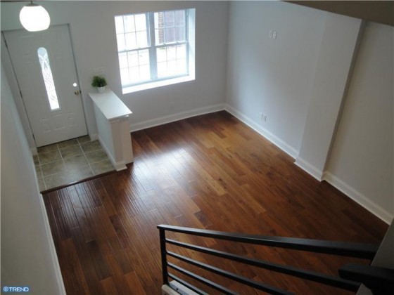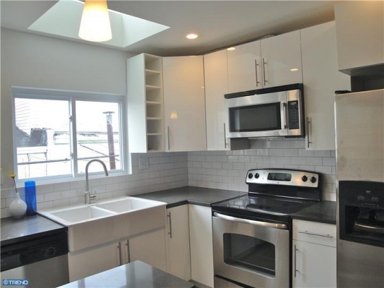 This newly rehabbed 2 bedroom, 1.5 bathroom house has about 1000 sqft. of living space right around the corner from E. Passyunk Ave. On the first floor is a powder room and a kitchen with quartz countertops, stainless steel appliances, a skylight, and a cool looking farmer’s sink. On the second floor are two bedrooms and a spa bathroom with a double vanity and a dual flush toilet. The master bedroom has a walk-in closet and both bedrooms have contemporary frosted glass pocket doors. About a block away is shopping, dining and nightlife on Passyunk Ave. This property is listed for $239,900 and comes courtesy of Cityspace.