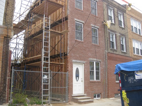 We see plenty of rehabs around town getting new front facades, but it’s rare that we see a building getting a new side wall. But that’s just what we encountered at 1308 S. 7th St., where we’re guessing a renovation that involved a new front facade necessitated the replacement of the party wall.