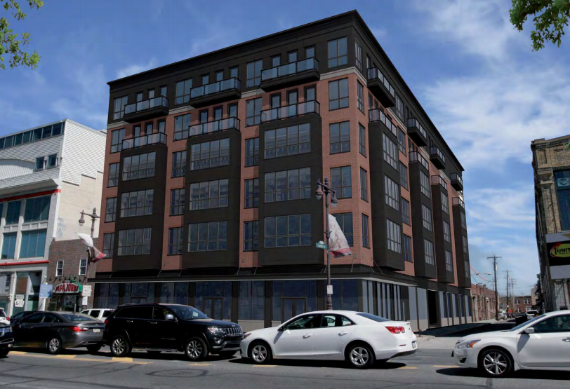 The building actually looks pretty good to us, but there's one thing in the rendering that's nagging us just a little. Now we enjoy Papa Johns as much as the next guy, but doesn't that little two-story building look a little silly in between the Rock School building and the proposed six-story building? One would imagine that the developers tried hard to buy that building but the owners weren't interested in selling. Alas.