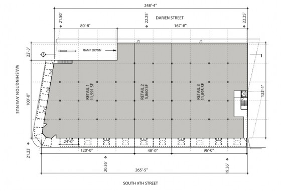 The current proposal would strike Anastasi’s and replace it with the new construction building pictured above. Three retail spaces are planned, with a 12K sqft space on the corner, a 6K sqft space in the middle of the building going south, and another 12K sqft space on the southern end of the building. Entrance to the parking garage would be on Washington Avenue.