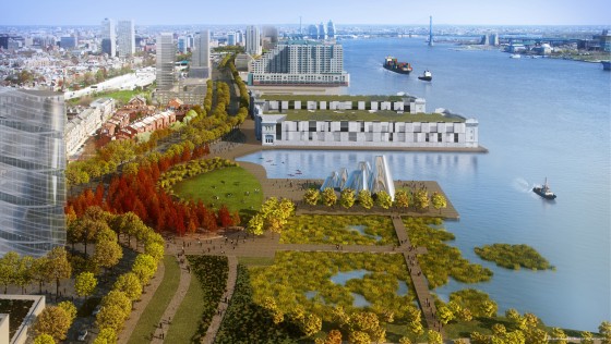 As we mentioned, the Washington Ave. Green we know today is merely the first step for this park, with several possibilities for improvements and expansion in the future. According to Planphilly, the next steps for the park are currently being considered, and we’re not talking about a small addition by any means. The centerpiece of Phase II for this park would be the construction of a self-supporting boardwalk that would allow park visitors to walk from the park’s current location upland onto the pier itself, floating in the river. With the addition of more wetlands and the construction of a ridiculous-looking building or two, the park could look like this in the coming years.