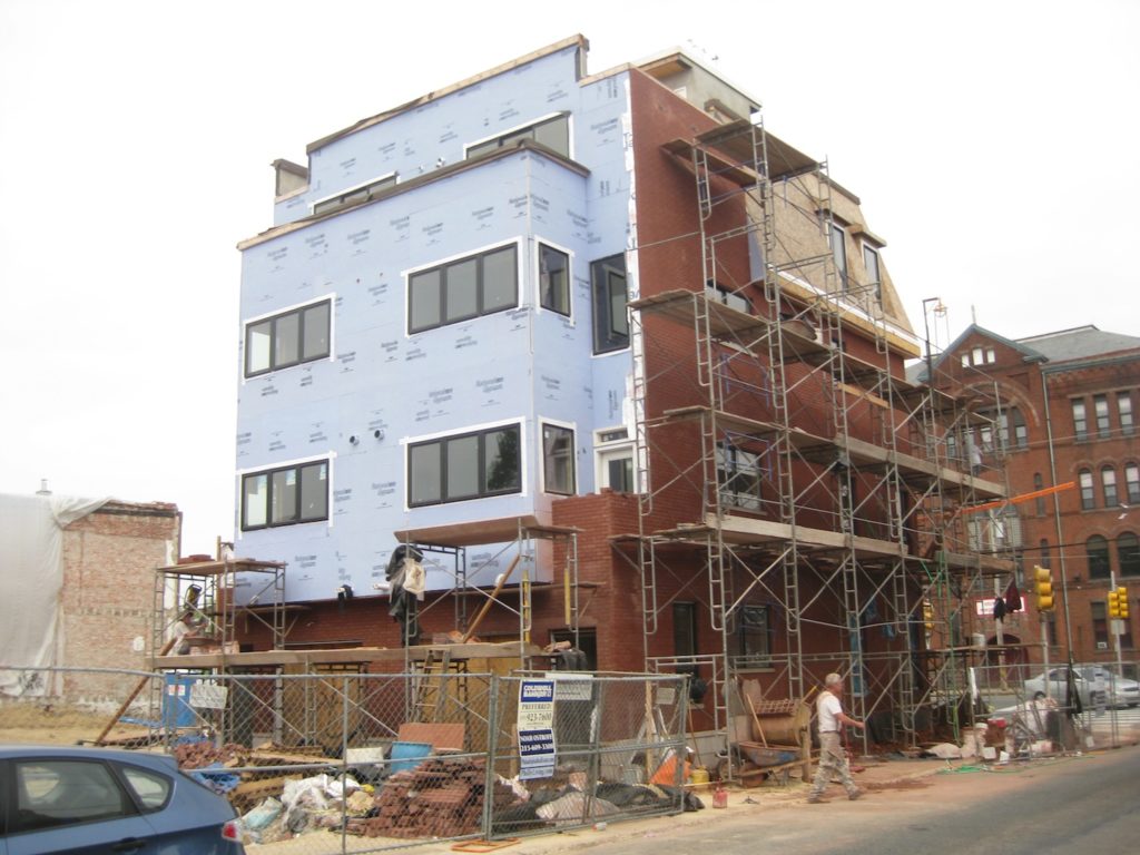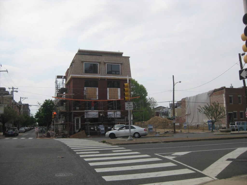 Shortly after demolition was completed, four foundations were poured and construction was underway on the first two homes. By last fall, two homes had been framed out right at the corner. And then, nothing. Work was completely stalled on the site. The reason, according to Plan Philly, is that the new homes were 22 inches taller than was permitted by the zoning variance the developers received. As a result, L&I shut down the site until the developers could resolve the problem.