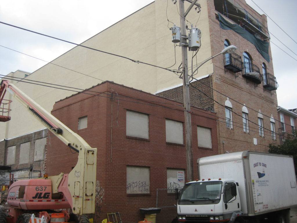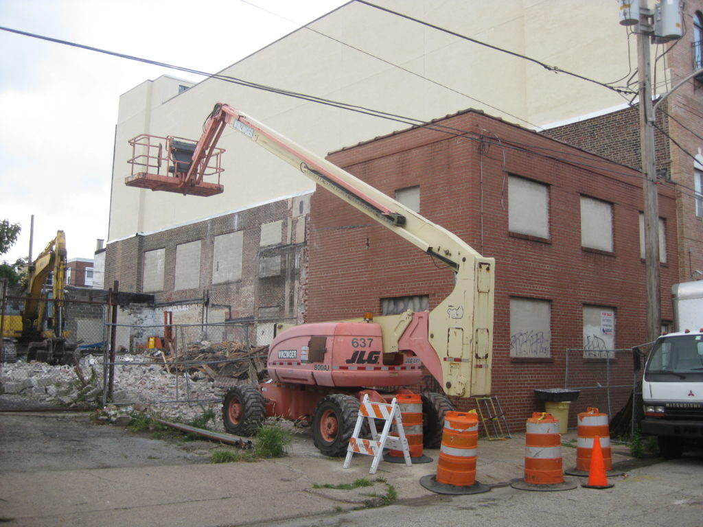 Does anybody out there have any info about this development, either the demolition or the addition next door? Also, does anyone remember when these buildings were last in active use? We’re guessing the cinderblock windows mean that it’s been awhile…