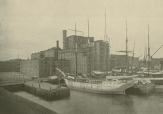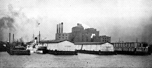 According to engineer George Newhall, whose court testimony is recorded in the 1912 volume, United States of America, Petitioner, Against the American Sugar Refining Company, “if you want to be very particular about it, I may say the Delaware Sugar Refinery was a molasses house and I remodeled into a sugar refinery.” Indeed, during this time, the South was in a phase of ongoing reconstruction following the devastation of the Civil War. Thus, much of the refining activity that took place near southern plantations soon migrated north to Philadelphia’s waterfront. Here below, the Delaware Refinery was taken over by the Franklin Sugar Refinery. The image below, taken from Philadelphia Buildings, shows the Franklin Refinery in 1899.