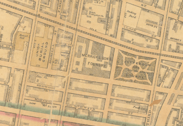 In 1836, the future site of swim lessons and pickup basketball games struck industrialist Samuel Vaughan Merrick as a great place for the Southwark Iron Foundry. The complex, fronted by Washington Ave. and contained by Federal, 4th and 5th Streets, is shown here below in an image taken from Samuel L. Smedley’s 1862 Philadelphia Atlas.