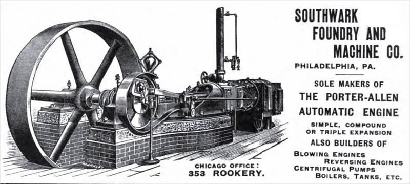 The Foundry would become an important fixture in the primordial South Philly neighborhood burgeoning with new immigrant arrivals. Factory workers helped to produce an array of iron-based commercial goods including, according to Vintage Machine, “boilers, bells and brass castings, iron boats, marine engines and boilers, sugar mill and hoisting machinery, and gas works machinery. In 1867, oscillating steam engines ‘having slide valves worked by eccentric’ were offered.” Perhaps unable to top the excitement of slide valves, the Foundry lapsed into inactivity for five years before merging with Porter-Allen Engine Co. in 1880. Incorporating as the Southwark Foundry & Machine Co., the company began pushing its Automatic Engine in Simple, Compound or Triple Expansion variations. Since we’re not experts on early engine design, we can only assume this refers to cup-holder fittings. No such fittings are visible in the image below, taken from an 1892 advertisement in the American Machinist.