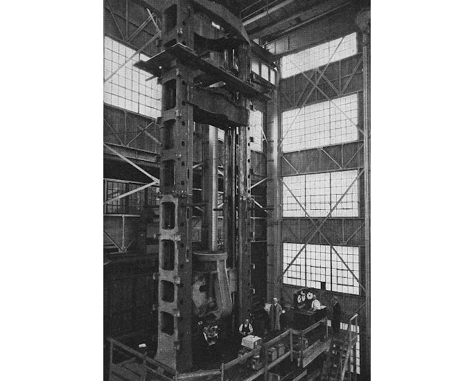 The Machine Company was eventually acquired by the Baldwin-Locomotive Company and renamed the Baldwin-Southwark Corporation. Below, a 1936 photo taken from the Progress is Fine blog shows the Baldwin steel-testing machine, declared here to be the largest in the world at over five stories high.