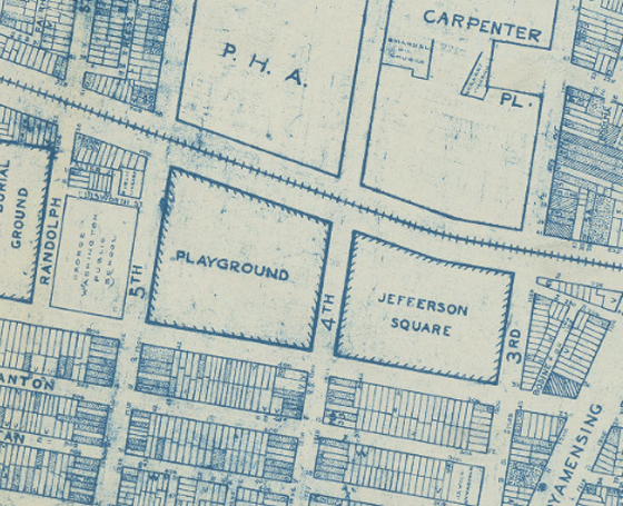 This would also represent the height of accomplishment for the company. Based on records maintained by the Smithsonian Institute, the Foundry appears to have ceased operations in 1945. The dormant smokestacks and vacant buildings were deemed unsafe for play and therefore removed. As shown in the image below, taken from the 1962 Works Progress Administration’s Land Use Map, Sacks Playground would replace the machine company with grass fields, basketball courts and a public swimming pool.
