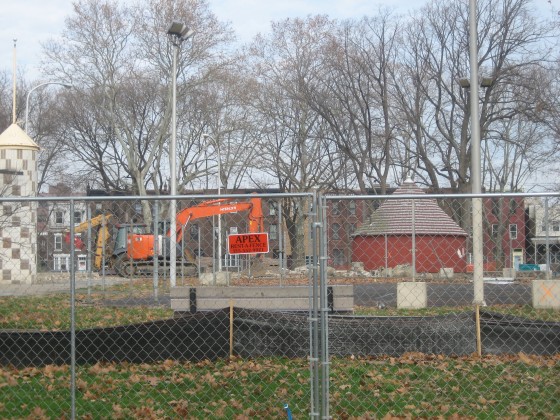 After a brief jaunt down to Pennsport to check out the future site of Moyamensing Estates, we passed by Dickinson Square Park and saw that the long-planned park renovation had finally begun. The chain link fence has been erected around the perimeter of the park and some heavy duty construction machinery in the middle of the park. This lovely three acre park, named after the former Pennsylvania governor, John Dickinson, is nestled in the heart of Pennsport between Tasker and Morris Sts., and E Moyamensing Ave. and 4th St., and has been around since 1900. According to the park’s history website, the site sits on the land of the former Pascal Iron Works, a manufacturer of stoves, grates, and machine parts for sugar refineries.