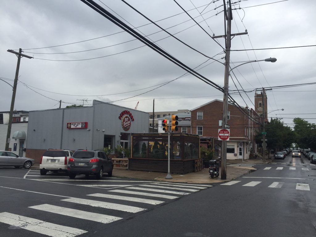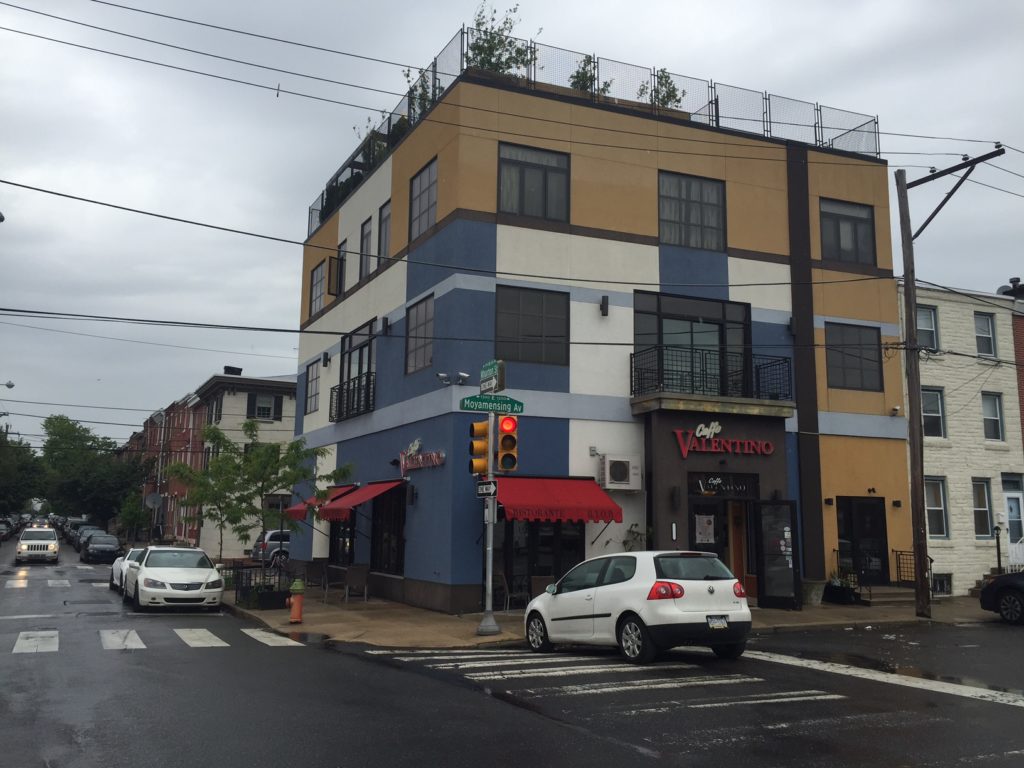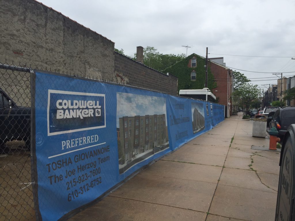 The intersection of Moyamensing Avenue and Wharton Street is one of the more satisfying in Pennsport, with the unique looking Caffe Valentino on the northwest corner and the wonderful and still newish Pennsport Beer Boutique on the southwest corner. We were making a run to Target yesterday and passed this intersection, and happened to notice a huge banner at the northeast corner advertising a new project. Until now, there's been a vacant lot and a one-story garage at this corner. But that's about to change.