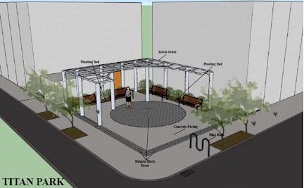 Yesterday, we got an email from the friends group, sharing the news that they've gotten funding from the City to undertake a full renovation of Titan Park. They're now working with the Department of Public Property to finalize a design, though that effort is being informed by the neighborhood's work with the Community Design Collaborate. On their Facebook page, they've shared a (kinda low-res) rendering of the current plan for the park, which is still subject to change.