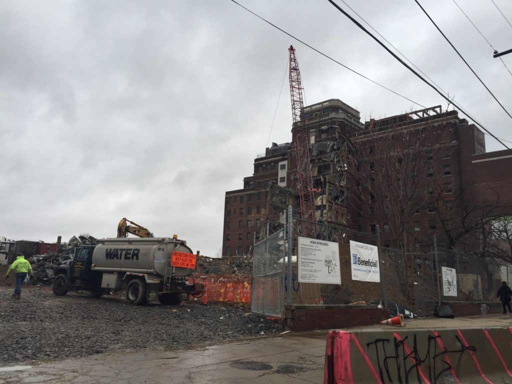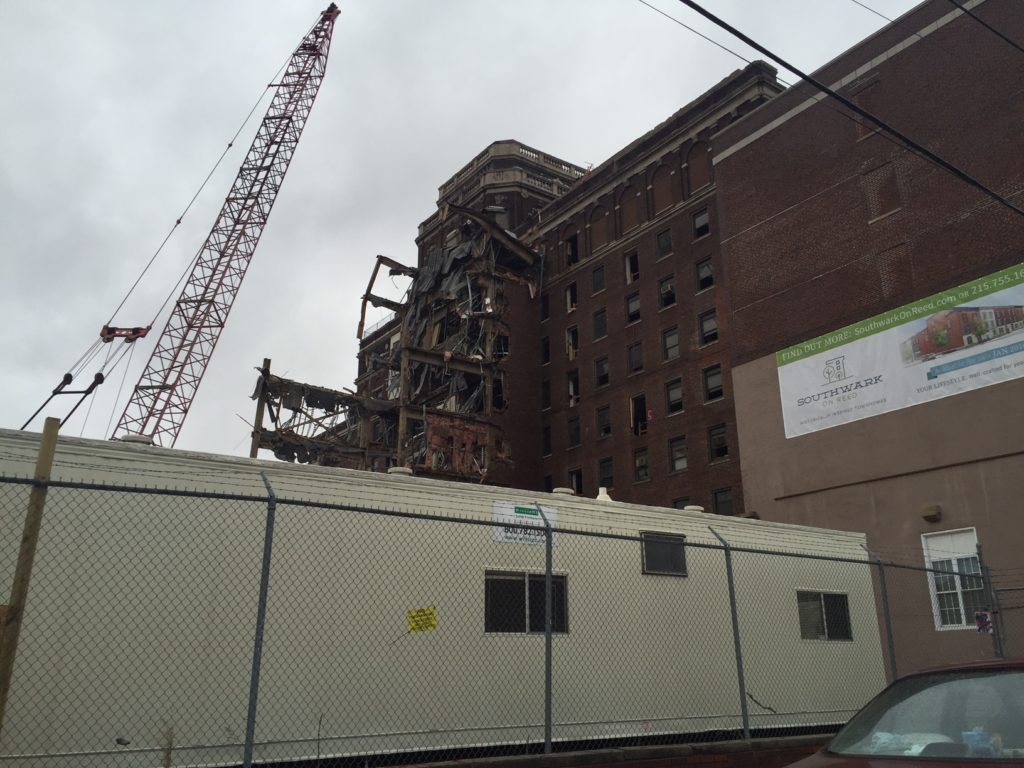 Pennsport's Mount Sinai Hospital is almost entirely gone. The building had sat vacant for several years while different developers considered various reuse options for the large building at 4th & Reed, but it was the Concordia Group that, in the end, came up with a project for this site that involved demolishing the old hospital. A refresher, they'll be building 95 homes with parking once the demolition is finished. Barton Partners did the design work.