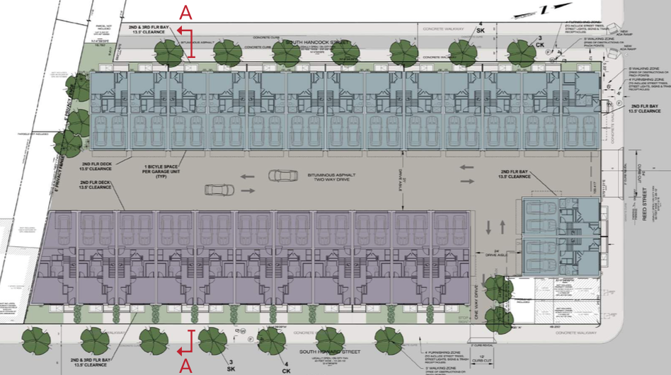 The layout of the homes will be rather standard fare for new construction homes with garages, with a bedroom on the 1st floor, kitchen/living/dining on the 2nd floor, and a pair of bedrooms on the 3rd floor. One interesting feature for this development is the inclusion of vegetated space in front of each home on Hancock and Howard Streets. We admit, we're a little nervous that these spaces could look pretty awful if the residents don't maintain them, but hey, that's what a condo association is for, right? But not so fast. It's typically the US Construction approach to rent out their homes for a few years before eventually putting them on the market, and we have to assume that'll happen here as well. So it'll be on their property management company to maintain these green spaces during the rental phase of the project.