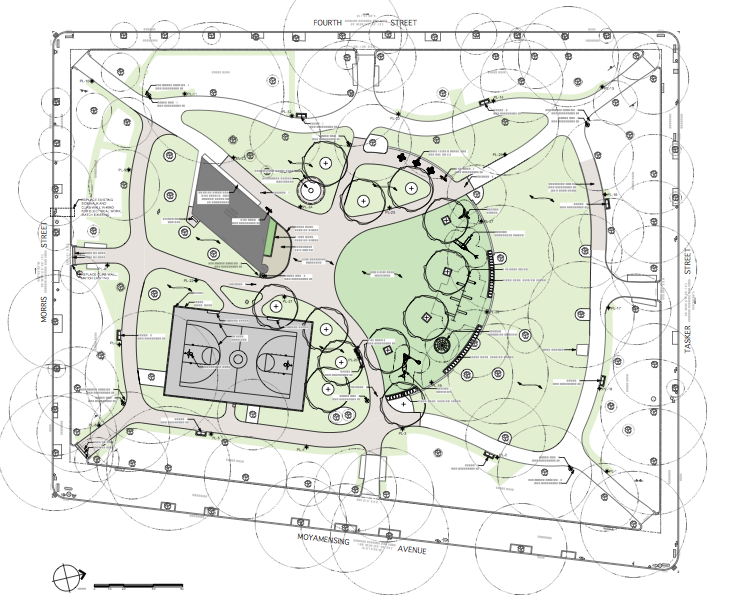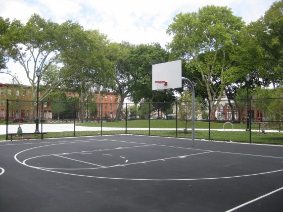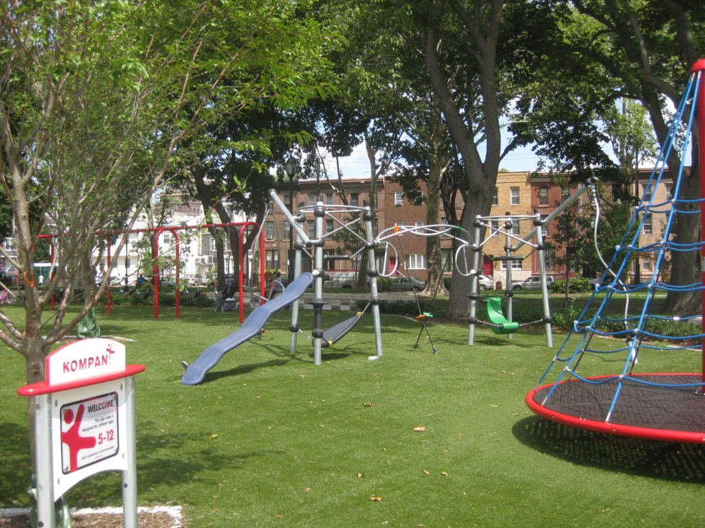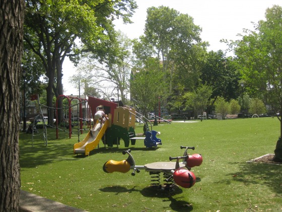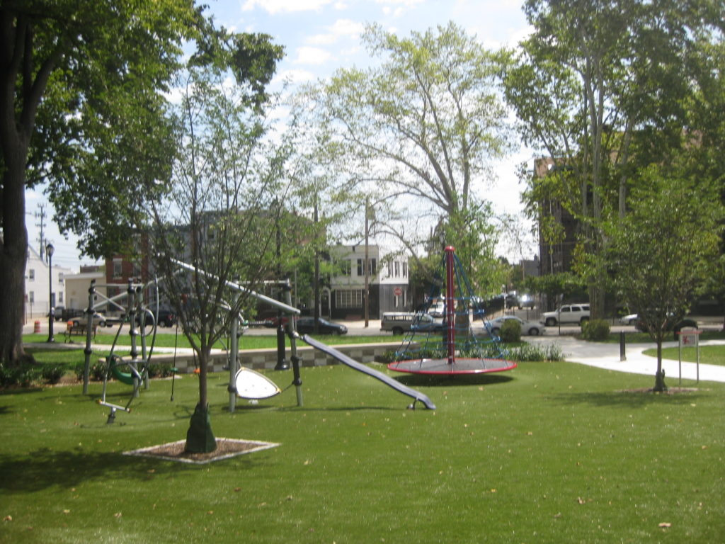 New benches, game tables, lighting, fencing, trash cans, bike racks, dog waste stations, plantings, and paving are some of the additions that have come about thanks to this project. Most noticeable, however, is the new play equipment that has been installed, with distinct areas for younger and older children to play. Surrounding the play equipment is artificial grass, which we imagine will be softer to fall upon during colder months than the ground. From a distance, it looks like the real McCoy, we’re just hoping local pooches don’t make that mistake.
