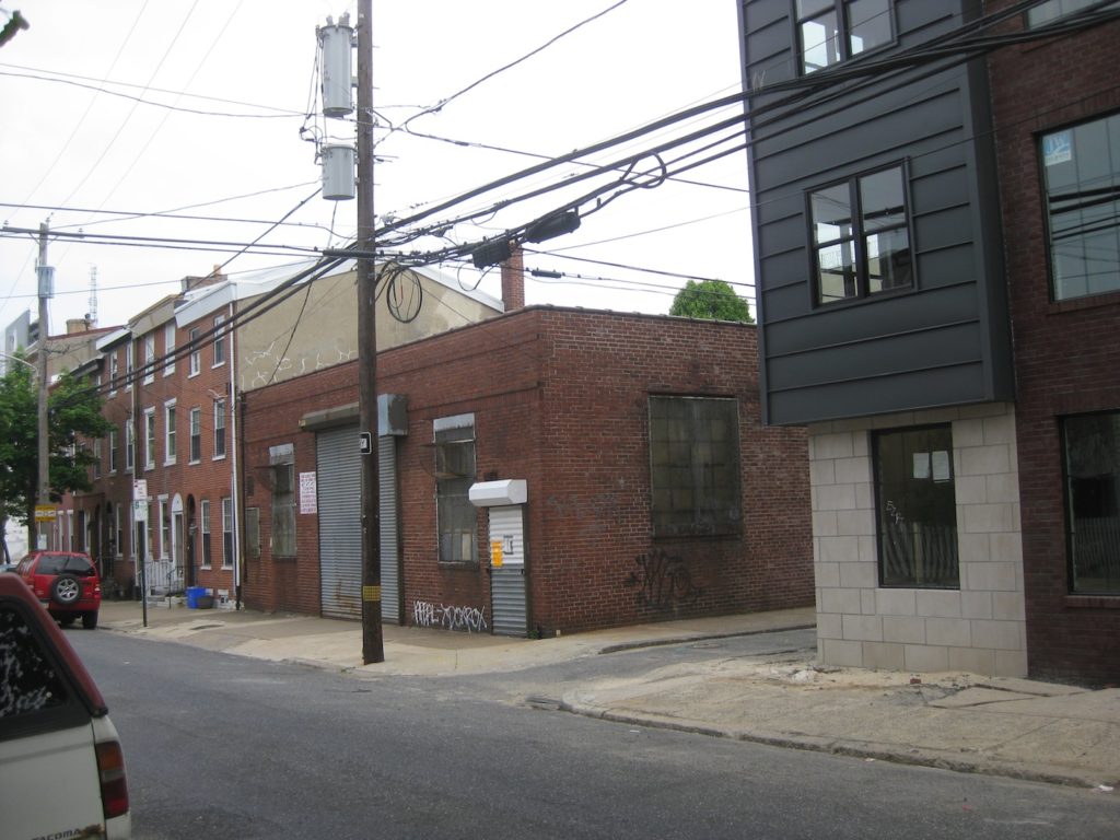 Well, it certainly seems like this project is a raging success. The fact that the second phase of homes so quickly followed the first was a decent indication. But an even better hint is that another row of homes is planned immediately to the east. Currently at 120 Wharton St., on the southeast corner of Hancock & Wharton, there's a one-story garage that looks pretty rough. A zoning notice on the building, however, suggests that it could soon disappear.
