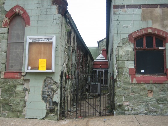 The 19th Street Baptist Church, which occupies a beautiful building right near the corner of 19th and Wharton Sts., is falling apart before our eyes. Last week, it received a Notice of Violation from L&I for its crumbling walls and collapsing roof. The notice informs the church and passersby that the city could demolish the building at any time and send the bill to the church if they don’t repair or demolish the building within thirty days. We don’t imagine that the city will be demolishing the church anytime soon, but if the building continues to degenerate at this pace it may become necessary as a matter of public safety. Such a shame.