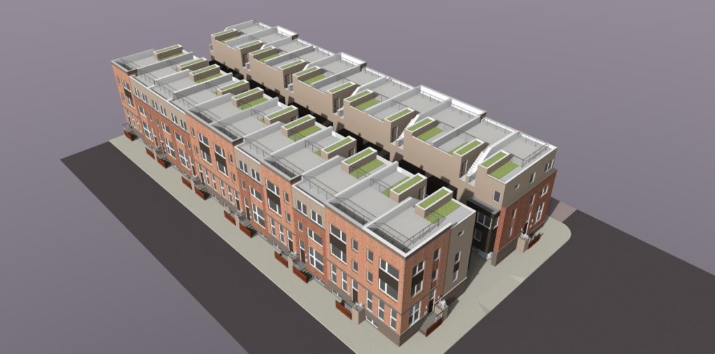 As we detailed previously, some members of the community had issues with the proposal for twenty-two homes at 20th & Wharton. Predictably, there were parking concerns. In an effort to address some of the concerns, the developers have revised the project and added 1:1 parking. This will mean a drive-aisle off of Wharton Street, but there's already a curb-cut so it won't impact the current parking environment. In addition, the mansards are gone but there's some new architectural variety between the units. Finally, per the request of some people in the community, the first floor space will remain active to maintain eyes on the street.