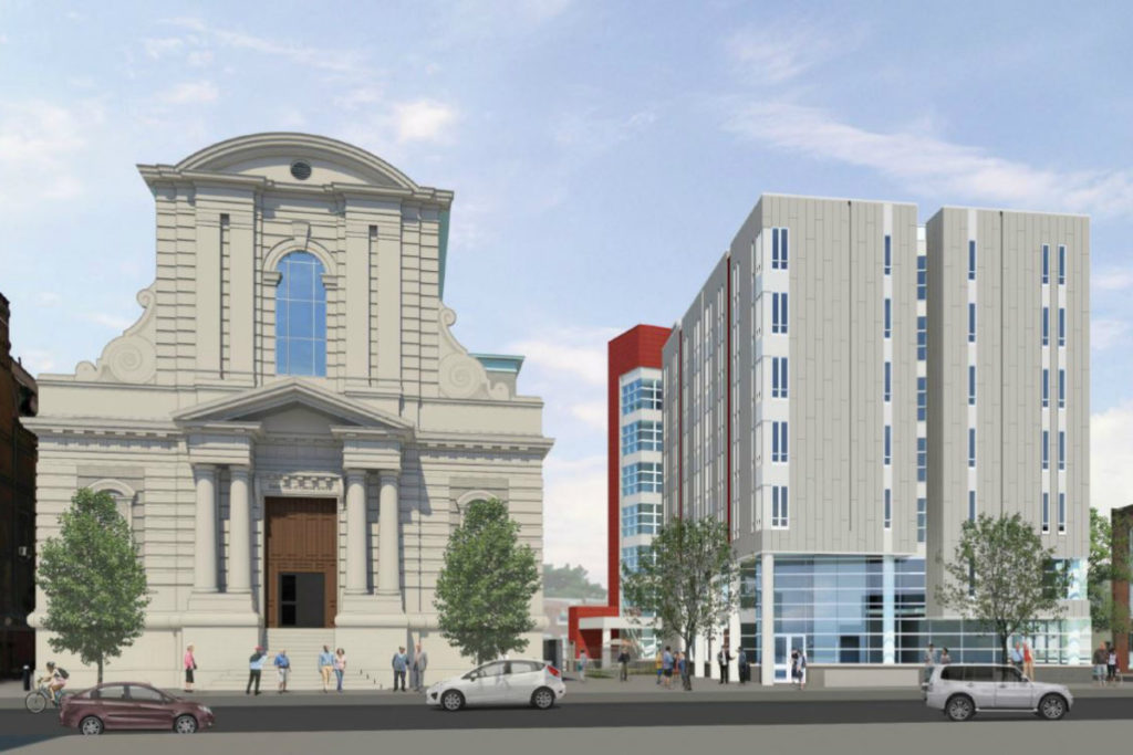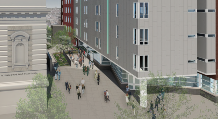 We weren't alone in panning the project and thankfully, Saint Rita's got the message. Earlier this year, we told you that Saint Rita's would be partnering with Catholic Health Care Services of the Archdiocese of Philadelphia to construct a new building that includes their desired new facility as well as dozens of affordable units for seniors. Over the summer, we shared some more details, noting that the plans called for a seven story building with 10K sqft of shrine-related use on the two bottom floors, 62 one-bedroom apartments on the five upper floors, and 8 parking spots. Cecil Baker + Partners did the design work, and we included a rendering with our story.