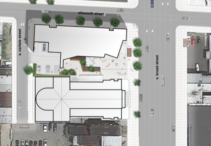We've had an eye on the southwest corner of Broad & Ellsworth for years, wondering when and if this large vacant South Broad Street property would get filled in. You may remember, the adjacent Saint Rita of Cascia Shrine owns the property and has been looking to expand there for quite some time, but it's been a struggle to come up with a plan that makes sense. In 2014 they announced a plan for a one-story building with a big surface parking lot in the back and we were incredibly disappointed about such an underuse for such a prominent corner.