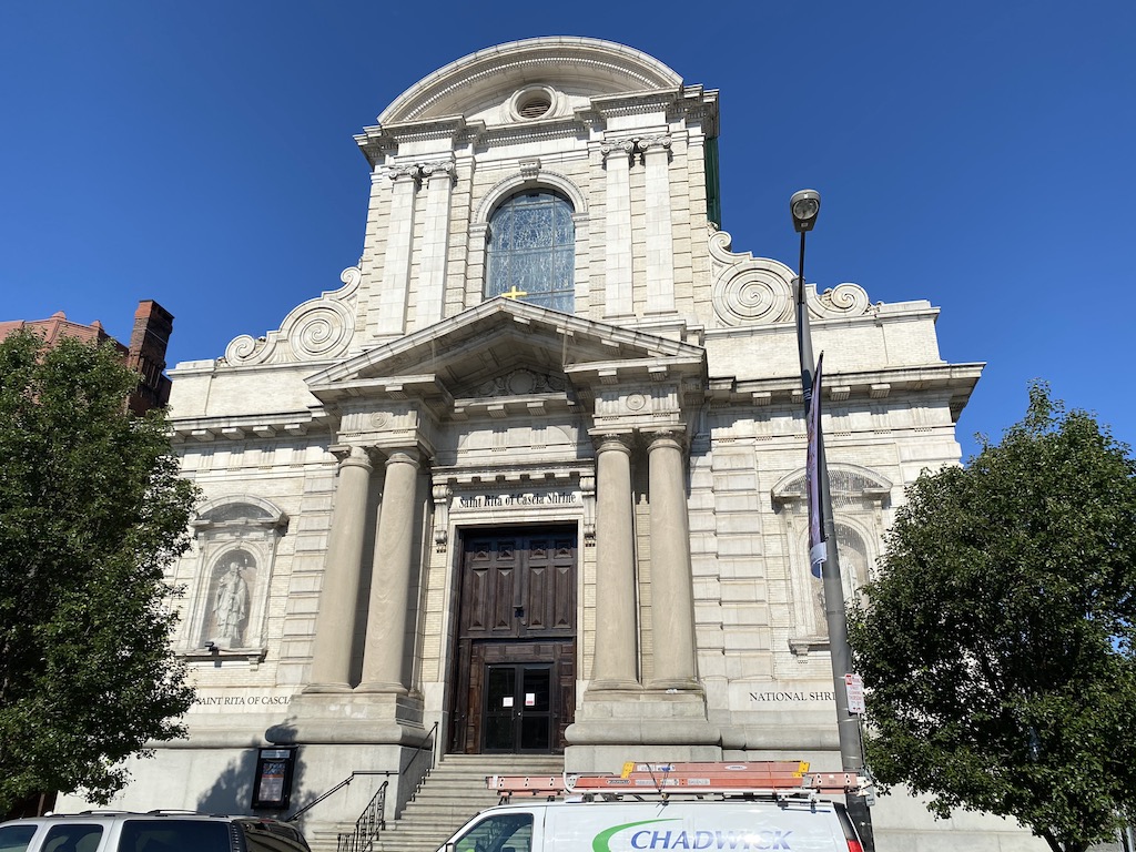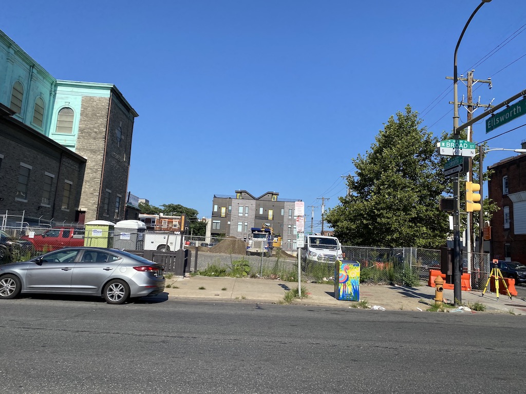 Roughly half a dozen years ago, we told you about the demolition of the former Saint Rita’s school at the southwest corner of Broad & Ellsworth. As the name suggests, the school was associated with the Saint Rita of Cascia Shrine, the handsome building located just next door, to the south. The demolition took place in anticipation of the construction of the Cascia Center, which was described at the time as “a place of healing, reflection, and assistance for all people.” The plans for the Cascia Center called for a two-story building with a surface parking lot at the corner, and those plans shifted to a one-story building. We weren’t satisfied with either concept, lamenting the underuse of a sizable and well located corner.