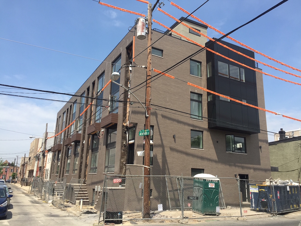 It was roughly two and a half years ago that we pointed a finger at the warehouse on the northwest corner of 17th & Annin, noting that it was not long for this world. We explained that the ZBA gave their blessing to a plan to demolish the building and replace it with a quintet of new homes with rear access parking. A year later, the warehouse was gone and foundations had taken its place. The project proceeded from there in fits and starts, but has picked up steam of late and looks like it’s going to be done sometime this summer. Somewhere along the line, and perhaps contributing to the construction delays, the project picked up an adjacent property and therefore a sixth home in the development.