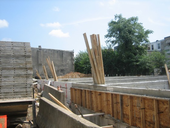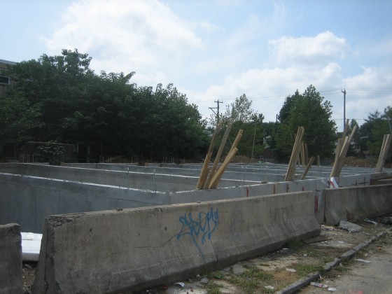 A reader tipped us off about construction taking place at the corner of 21st and Annin Sts., so we found five minutes when it wasn’t pouring and checked it out. When we arrived on the scene, there was no work actively going on, but we did discover six fresh foundations spanning 2046-2056 Annin St., along with a truck with a stack of form work on its bed.