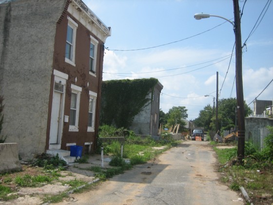 It’s one of the most bombed out blocks in the neighborhood! On the north side of the street are the backs of the houses on Ellsworth St., which are not exactly welcoming. But it’s better than the south side, which is about eighty-percent vacant. Of the handful of houses that are still standing, most are boarded up buildings begging to be torn down or threatening to simply fall over by themselves. We’re not sure how long the rest of the block has been this bad, but we do know that these six lots have been vacant since at least 1991, when they were procured by St. Paul Chapel Baptist Church, located around the corner at 21st and Manton Sts.