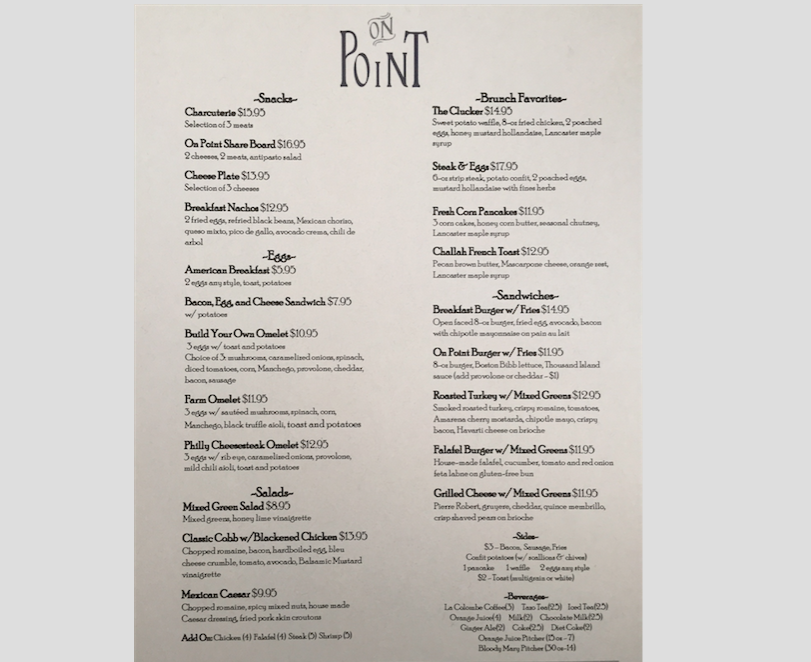 The menu looks tasty, and generally pricier than its predecessor. We wish On Point Bistro all the success in the world, and not just because our parent company manages the property. Point Breeze has come a very long way in a very short period of time, and attractive local businesses will only help the neighborhood continue to thrive. We sampled the American Breakfast today and it was totally "on point," if you know what we mean. Okay, nobody can make that joke again, agreed?