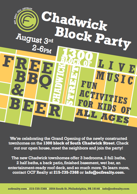 To celebrate the completion of the first phase of homes on this block, OCF Realty (the company that pays for this website of course) is hosting a block party on Sunday, August 3rd, from 2pm until 6pm. Neighbors, friends, and family are invited to join the fun, where there will be BBQ, booze, live music, games for kids, and an opportunity to walk through one of the new homes. C'mon and check it out. It's not like you'll have a better time watching the Phillies game on Sunday afternoon.