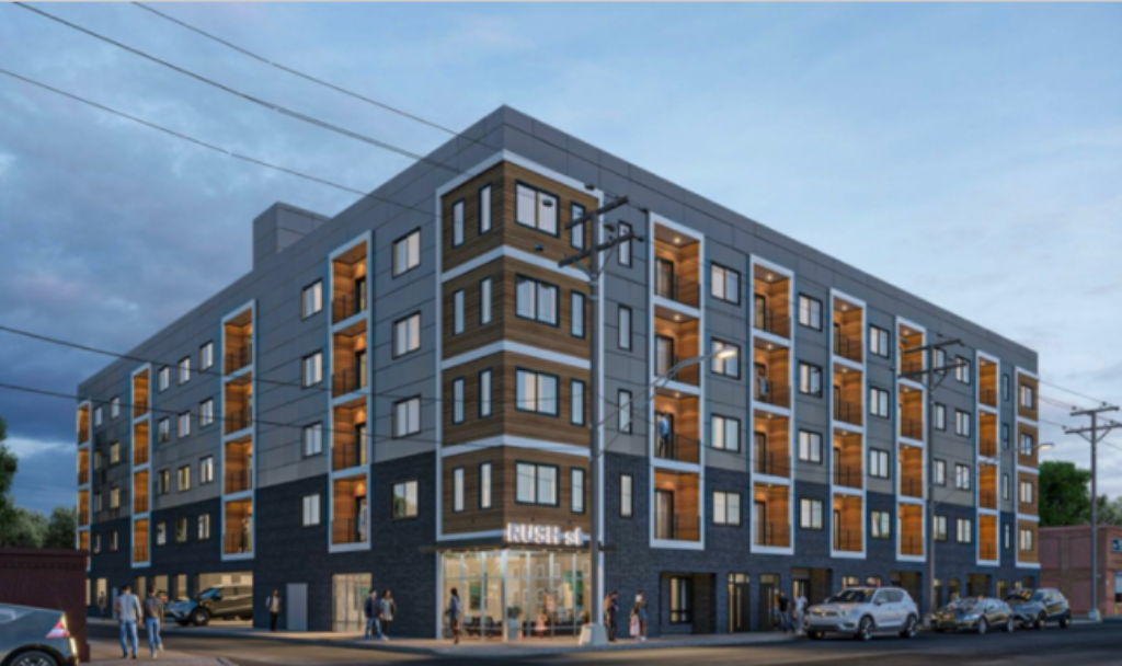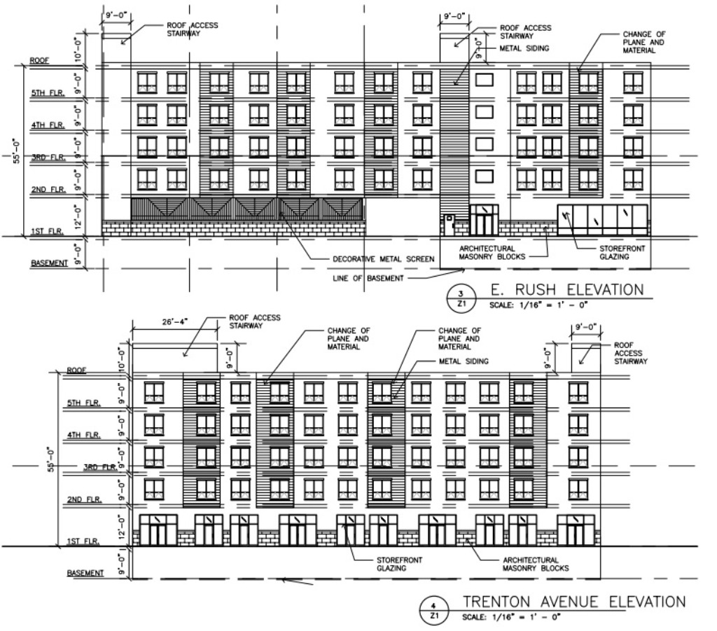 Multiple building permits have been pulled for the project within the past week, so we expect to see work get started soon. This project is just across Trenton Avenue from another proposal that is full steam ahead. 2149 E. Rush St. has also received building permits and machinery is on-site. 72 units will be included in this five-story building along with artist studios. Check out what’s coming, with architecture courtesy of DesignBlendz.