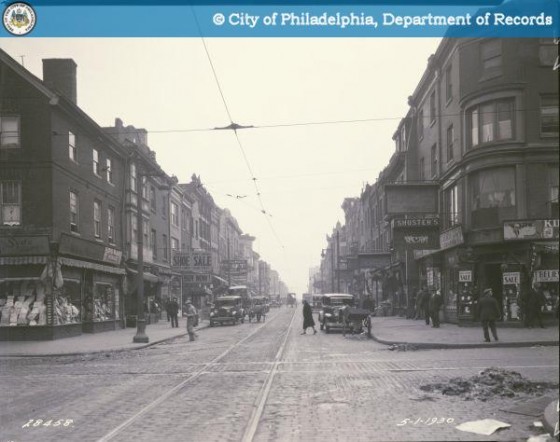 Larger than the surrounding tailors, clothiers and cobblers in its midst, the building constructed in 1908 was called the Crystal Palace. According to Rivest’s Ultimate List of Movie Theatres, this was among more than 100 Nickelodeons that proliferated throughout the city in the aughts and teens.  In 1927, at the start of Hollywood’s Golden Age, RKO-Warner Bros. occupied the building and renamed it the New Palace Theatre.  According to Shawn Evans of PhillyHistory.org, this would make it one of 275 new full-length motion picture theatres to open in Philly through 1932.  Though the theatre itself is not visible, the photograph here, taken from the Department of Records, shows South Street, looking west from 3rd.  The New Palace Theatre is on the left side, roughly 2/3’s of the way down the street.