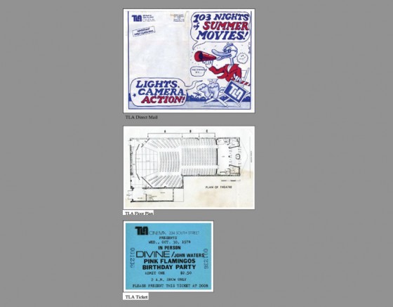 It was at this juncture, in 1971, that it once again turned its attention to cinema, though of a different kind.  The mailers, floor-plan and ticket-stub taken from the TLA Style site and shown here below capture the theatre’s general fare during America’s heyday of art-house cinema.  Indeed, the TLA would become a foremost forum for Rocky Horror Picture Show screenings and all the cross-dressing fanfare attendant thereto.