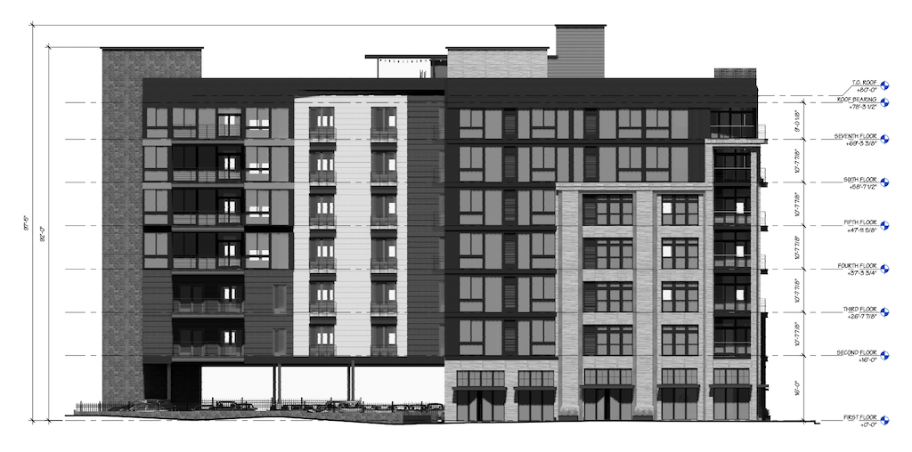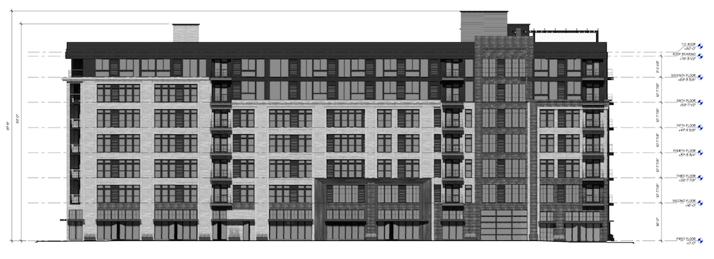 We don’t know what caused a delay in this project, but we wouldn’t be surprised if it rhymes with shmovid. If there’s any silver lining to the delay, it’s that a new plan is being pursued for the property, and for our money it’s an improvement over the previous scheme. The current plan, for which the developers pulled a zoning permit earlier this month, calls for a seven story building with ground floor retail and parking, along with 157 units on the upper floors. Target is clearly out, as one retail space measures about 4,000 sqft and will sit at the corner of 5th & Bainbridge, while a 1,600 sqft space will be at the corner of Leithgow & Bainbridge. A lobby and 37 parking spots will fill the rest of the ground-floor level, along with utility space, a trash room, a bike room, and so forth. Bernardon is doing the design work, and we can share these elevations drawings: