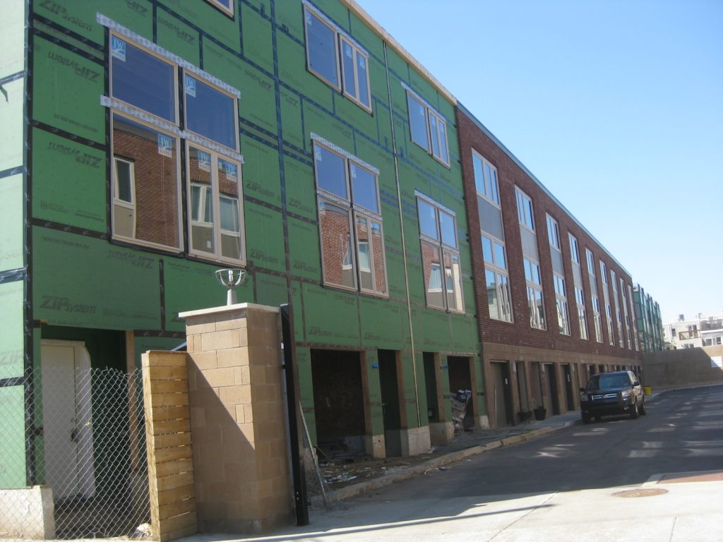 At that time, we weren't certain whether these homes were indeed part of the original development or if they were their own thing. Passing by today, we discovered that they are indeed a part of the Queen's Walk development. The homes, which are framed out, will look the same, and have similar parking access via a shared interior driveway.