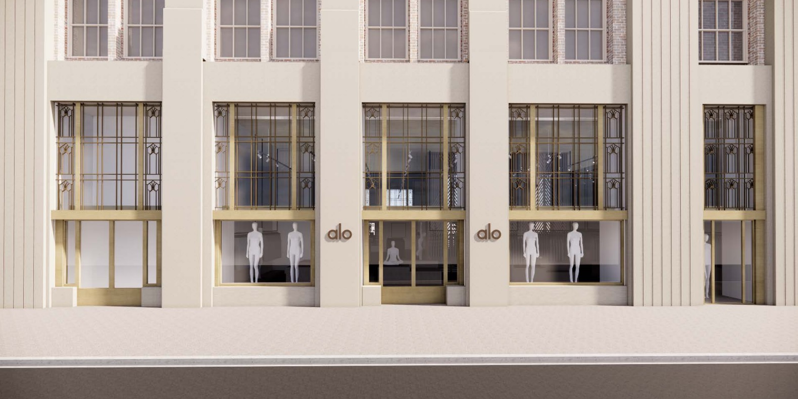 Thanks to submissions to the Sign Committee of the Art Commission, we know that several other changes are afoot along one of the prime retail and commercial corridors in the region. We’ll continue along to the east of the Laurel, where the historic storefront at 1608 Walnut St. is set to undergo quite the change. After visiting this building in the fall when it was announced that Pierce College will be making their new home on the upper floors of the building, we noticed the Modell’s storefront looking a bit ragged as it searched for a new ground-floor tenant. It appears that yoga apparel company Alo will be taking over the main floor, creating a streamlined look for this ornate building. We hope that this new design also comes with a thorough power-washing.